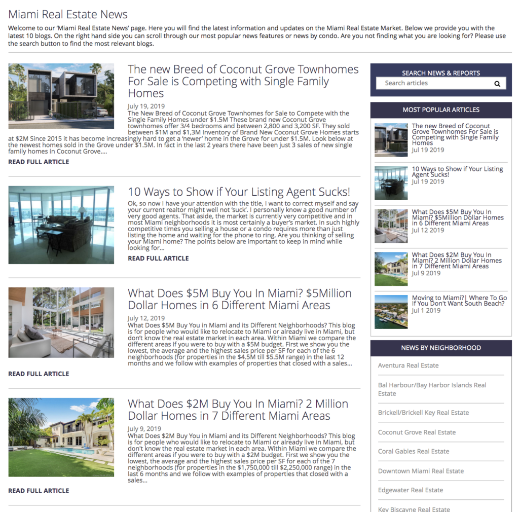 In 10 years in we have covered: The best condos, the best neighborhoods, the best communities, the best schools districts, the state of the market, economic analysis, new home analysis, building a new home in Miami, old home analysis, neighborhood vs neighborhood, dangers in the market, emerging markets/neighborhoods, danger zones, zoning changes, changing psychology, global demographic observations and impacts on Miami, lessons learned, Miami real estate forecasts and so much more.